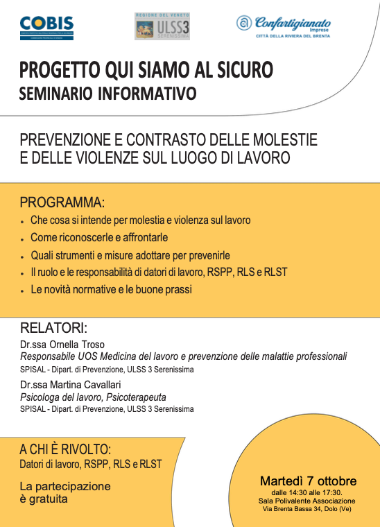 L’Associazione, in collaborazione con Cobis Provinciale di Venezia, nel ambito del tema “salute e sicurezza di genere”, organizza martedì 7 ottobre, dalle ore 14.30 alle 17.30, presso la nostra Sala polivalente in via Brenta Bassa 34 a Dolo, un incontro informativo/formativo dedicato ai datori di lavoro, RSPP, RLS e RLST dal titolo: Qui siamo al sicuro”. L’incontro è finalizzato ad affrontare il delicato tema delle “molestie sui lavoro”. Il progetto, promosso dalle OO.SS.LL., è condiviso non solo dalle Associazioni dei Datori di lavoro della Metropolitana di Venezia ma anche dalla ULSS3 Serenissima ed è specifico per le realtà Artigiane. Si tratteranno i temi delle molestie e violenze nei luoghi di lavoro come rischi reali i quali possono compromettere la salute, la sicurezza ed il benessere delle persone.